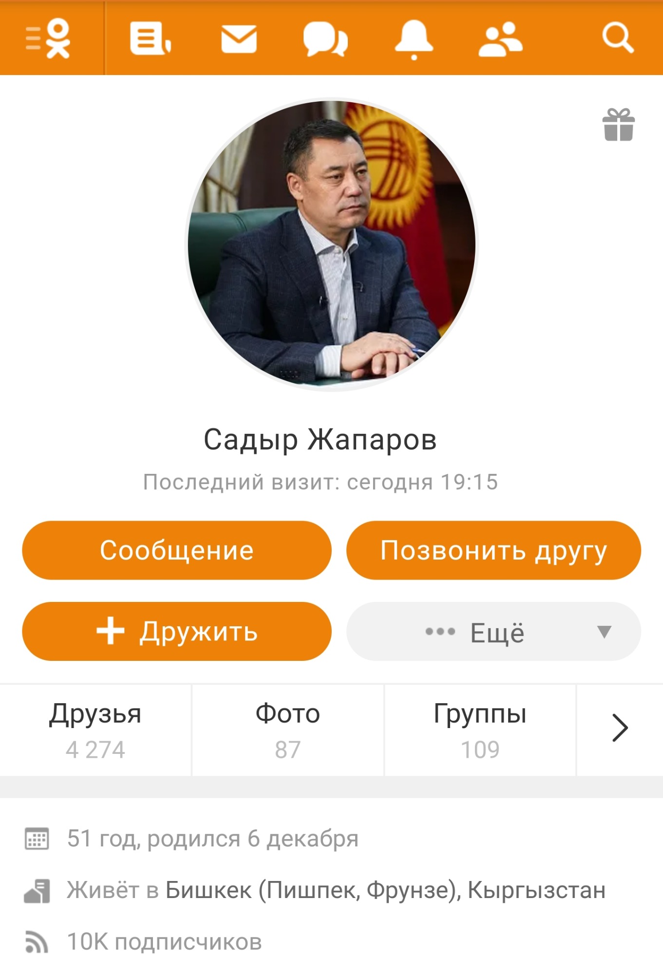 В «Одноклассниках» на Садыра Жапарова подписаны 10 тысяч 64 человека.