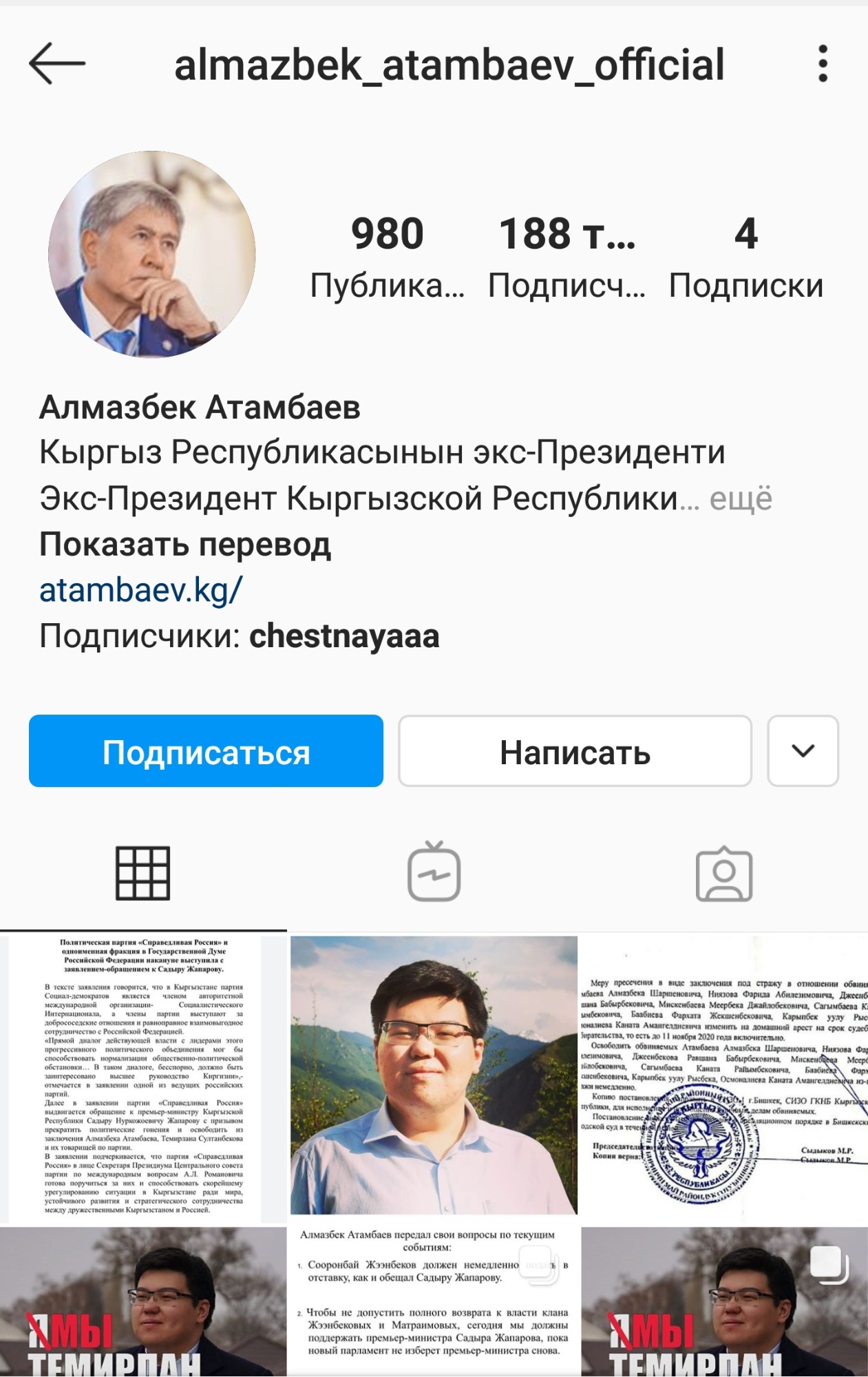 Страницу Алмазбека Атамбаева, очевидно, ведут его сыновья и сторонники партии. В аккаунте он указан как «экс-президент», хотя этого статуса его депутаты лишили. За его Instagram следят 188 тысяч подписчиков.
