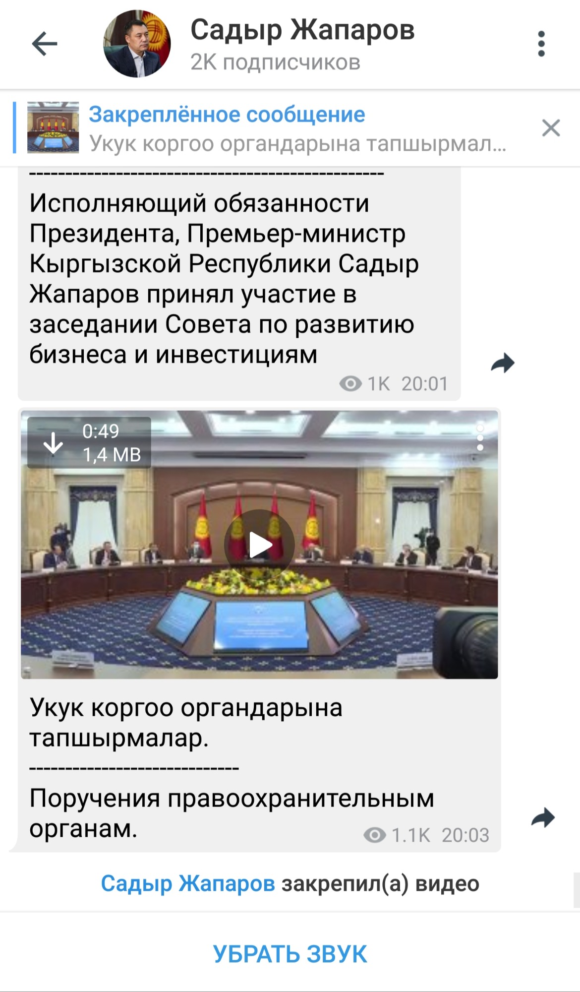 В Telegram-канале Садыра Жапарова чуть больше 2 тысяч 200 подписчиков. Канал создан 7 октября 2020-го. Там политик публикует фотографии, видео и официальные сообщения о своей деятельности.