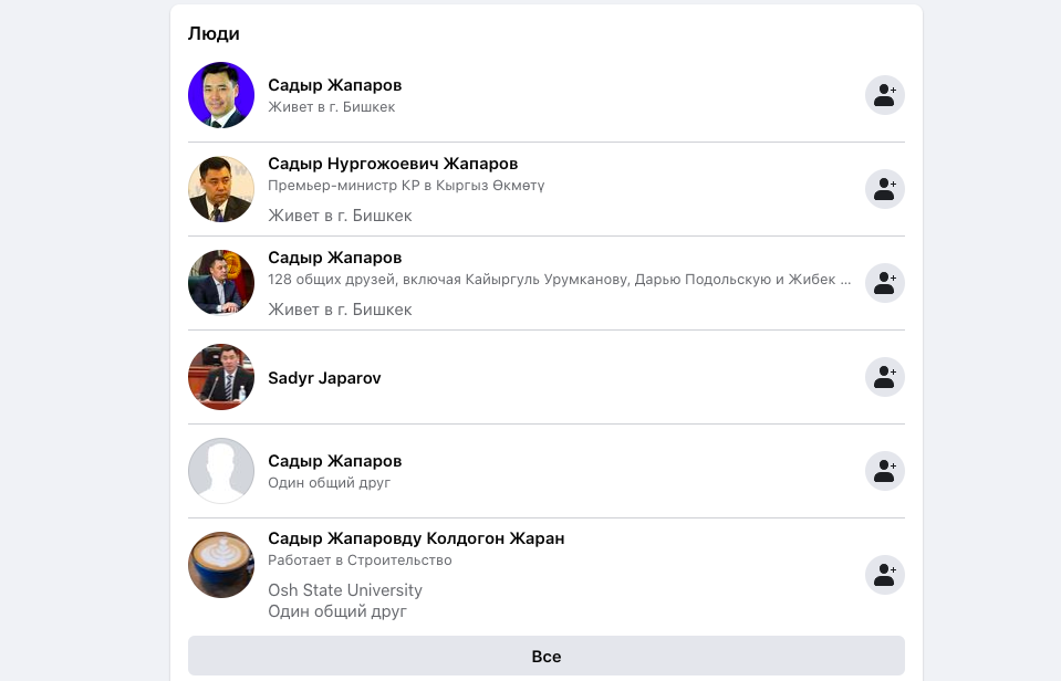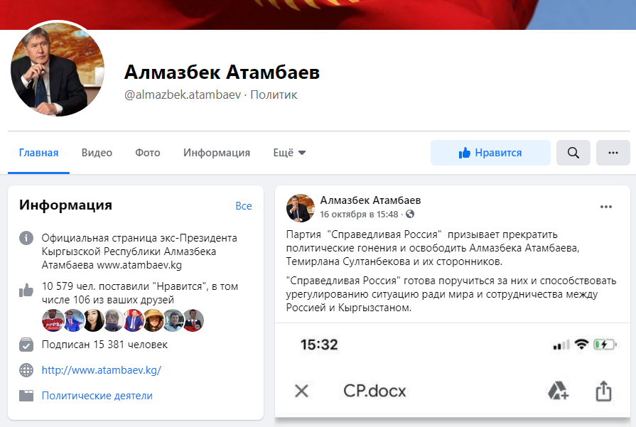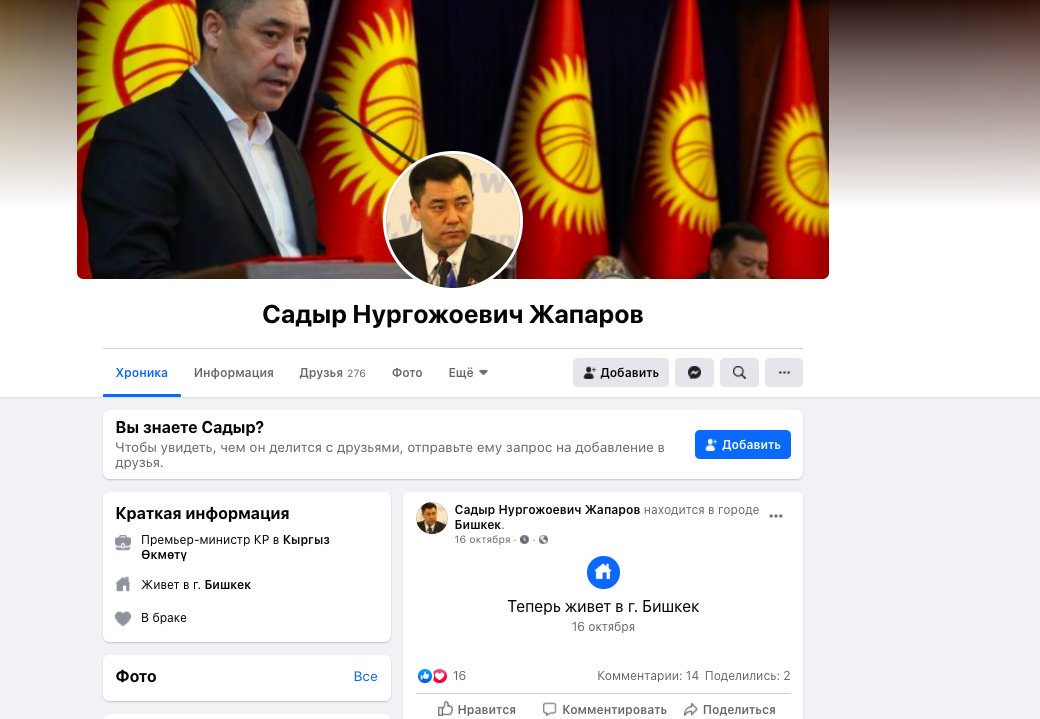 Одна из первых публикаций на странице Facebook Садыра Жапарова сделана в 2012 году, когда он еще был депутатом парламента. Есть также группа в его поддержку, созданная в 2014-м. В ней зарегистрированы 138,3 тысячи подписчиков.