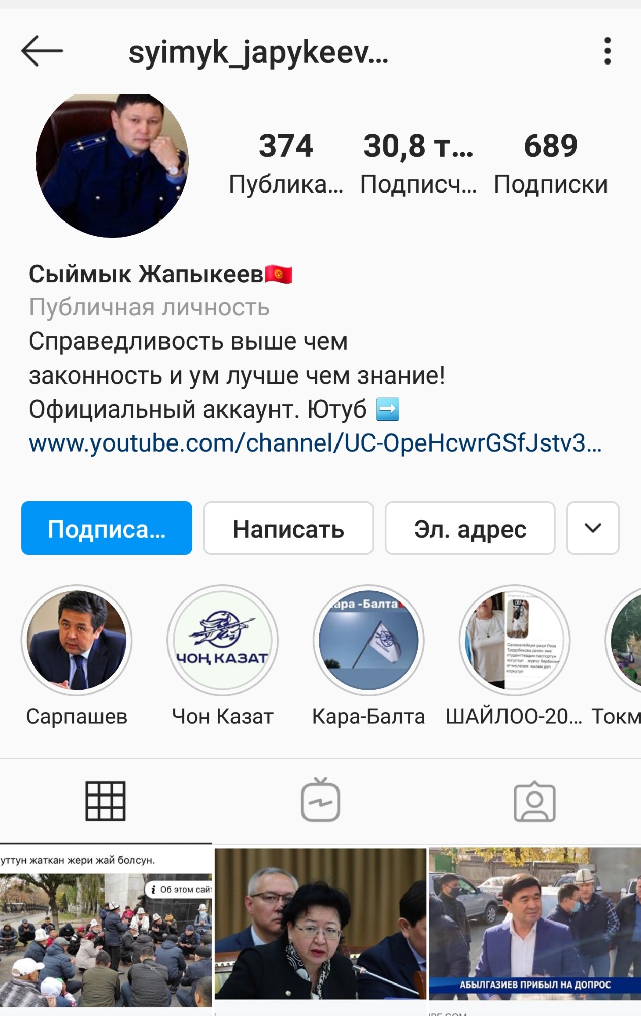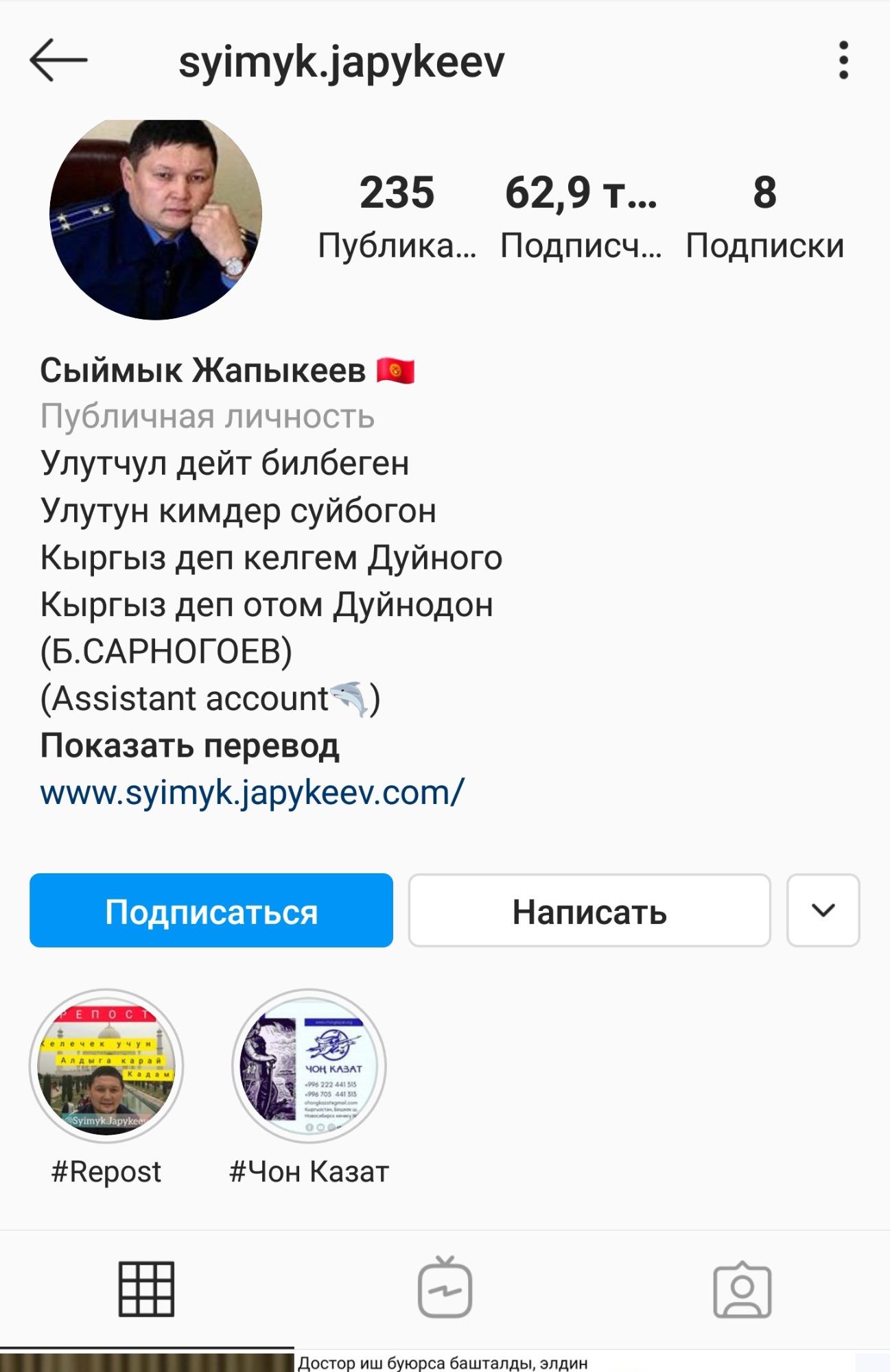 Еще один чонказатовец Сыймык Жапыкеев тоже получил должность — стал председателем Финполиции. Широкую известность ему принесли выступления в соцсетях. Бывший прокурорский работник устраивал прямые включения со своей кухни и делал громкие заявления, которые нравятся определенной группе людей. У него появилось много поклонников. Жапыкеев отличился своим эпатажным поведением, неуравновешенностью и особенностью выражать свое мнение резко и эмоционально, используя нецензурную лексику, выходя за рамки приличия в прямом эфире.У главы ГСБЭП два Instagram-аккаунта. В первом — около 63 тысяч подписчиков, во втором — около 31 тысячи.