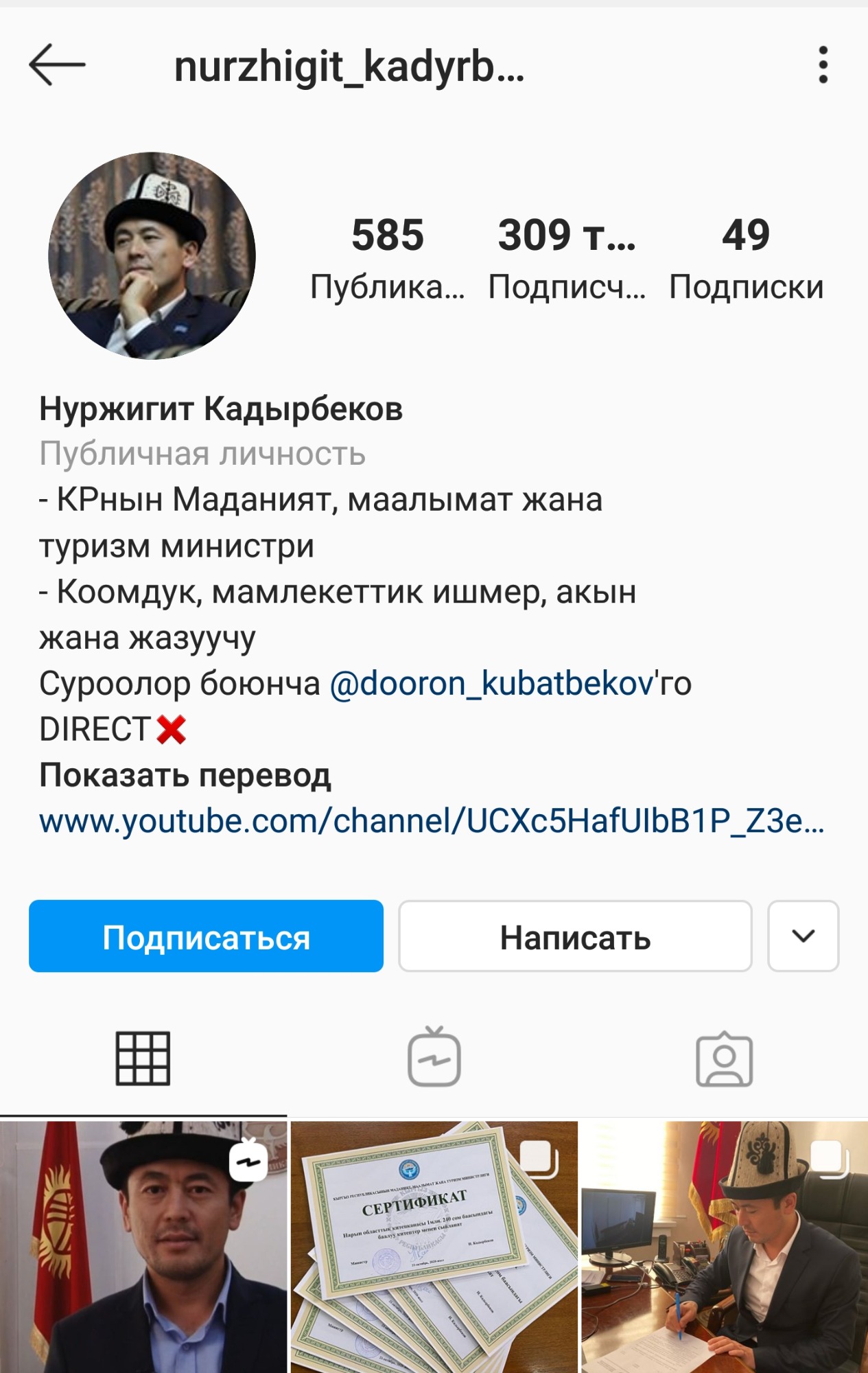 Министр культуры, информации и туризма Нуржигит Кадырбеков — один из немногих в правительстве, кто имеет большую аудиторию в соцсетях. В Facebook у чиновника более 12 тысяч подписчиков, в Instagram — 309 тысяч.У остальных членов кабинета министров, в частности, у первого вице-премьер-министра Артема Новикова, главы Минэкономики Санжара Муканбетова, министра финансов Кыялбека Мукашева и даже у председателя Государственного комитета информационных технологий и связи Алтынбека Исмаилова, активных аккаунтов в соцетях нет.