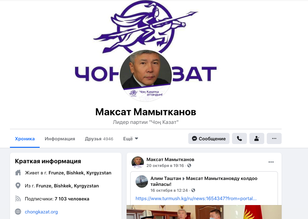 Свой Telegram-канал есть и у вице-премьер-министра и одного из лидеров партии «Чон казат» Максата Мамытканова. Там всего 209 подписчиков, и в последнее время он не так активен.На личной странице в Facebook у чиновника 7 тысяч 102 подписчика и почти 5 тысяч «друзей».