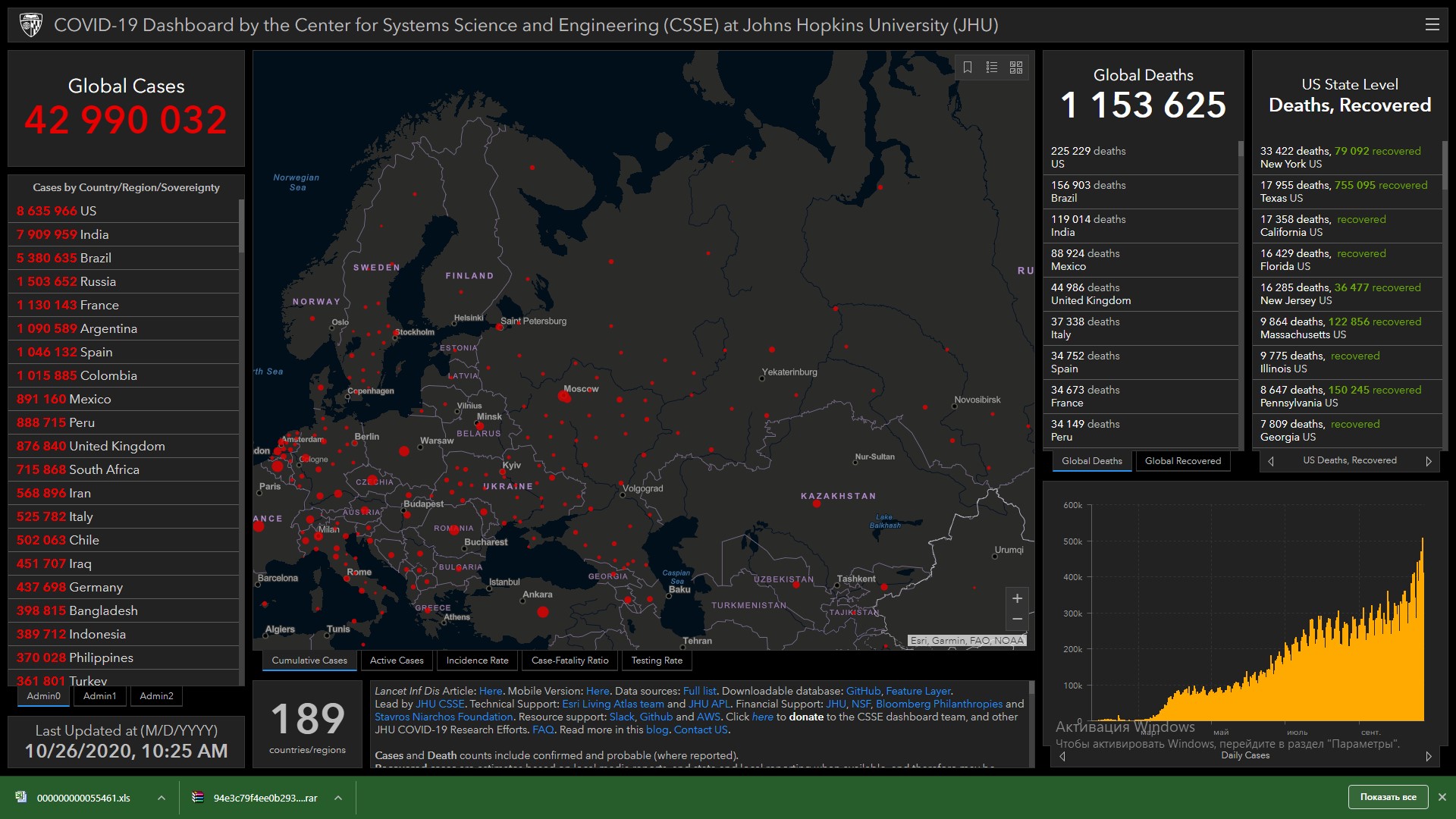 Всего в мире коронавирусом заразились 42 миллиона 990 тысяч 32 человека. Больше всего зараженных в США (8 миллионов 635 тысяч 966), Индии (7 миллионов 909 тысяч 959), Бразилии (5 миллионов 380 тысяч 635), России (1 миллион 503 тысячи 652), Франции (1 миллион 130 тысяч 143), Аргентине (1 миллион 90 тысяч 589), Испании (1 миллион 46 тысяч 132), Колумбии (1 миллион 15 тысяч 885), Мексике (891 тысяча 160) и Перу (888 тысяч 715).