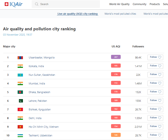 В рейтинге крупнейших городов мира по качеству воздуха World Air Quality на 19.30 Бишкек находится на 7-м месте.