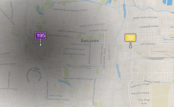 - в районе улиц Бейшеналиевой/Токтогула. Уровень загрязнения превышен в 1,74 раза: PM2.5 среднесуточный — 61 мкг/м³, на момент измерения — 195 мкг/м³;