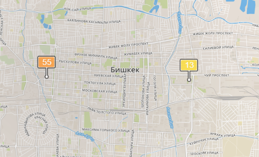 • в районе улиц Бейшеналиевой/Токтогула. Уровень загрязнения превышен почти в два раза: PM2.5 среднесуточный — 73 мкг/м³, на момент измерения — 55 мкг/м³;