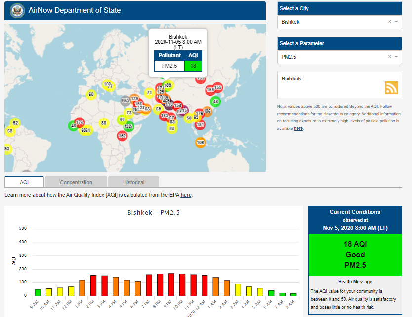 Посольство США в Кыргызстане также установило датчик. Он показывает индекс качества воздуха в режиме онлайн. Информация обновляется ежечасно.