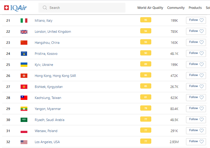 В рейтинге крупнейших городов мира по качеству воздуха World Air Quality на 8.30 Бишкек находится на 27-м месте.