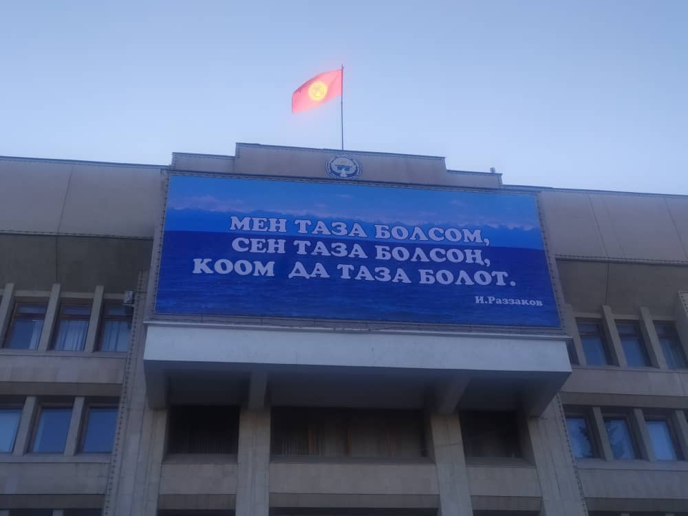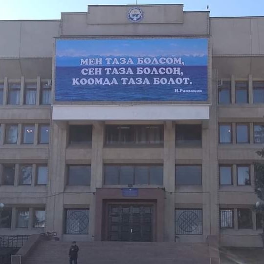 Ранее пользователи социальных сетей опубликовали фото баннера, который вывесили со стороны главного входа в полномочное представительство правительства в Иссык-Кульской области. Высказывание Исхака Раззакова распечатали с ошибкой. Словосочетание «коом да» написали слитно — «коомда».