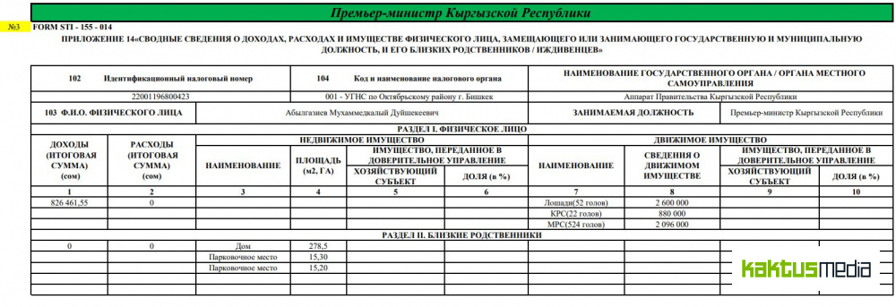 В 2018 году доход премьер-министра составил 826 тысяч 461 сом. В активах были 52 лошади на 2 миллиона 600 тысяч сомов, 22 коровы на 880 тысяч и 524 головы мелкого рогатого скота на 2 миллиона 96 тысяч сомов.