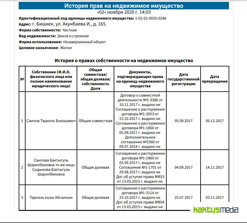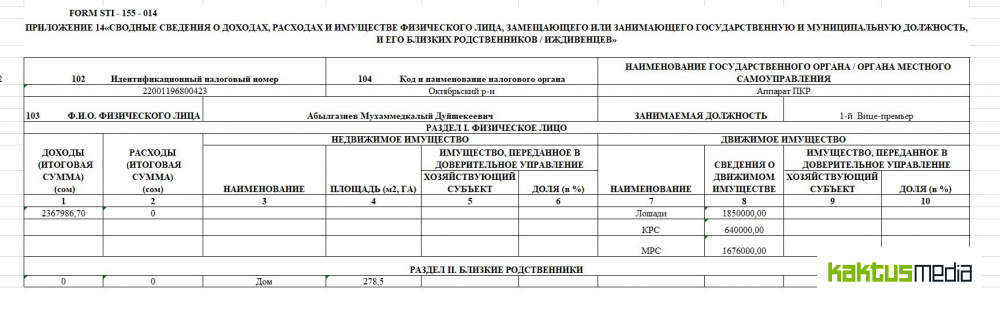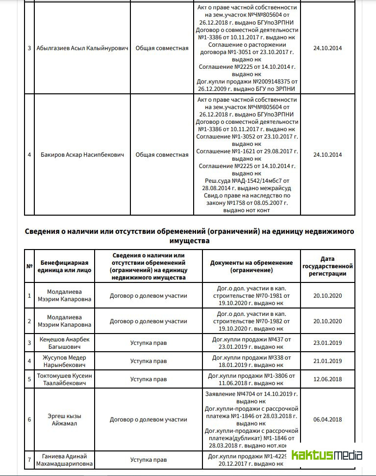 По данным интернет-издания, у племянника Абылгазиева — Асыла Абылгазиева вместе с бизнес-партнерами сотни квартир в Бишкеке, при этом у самого бывшего чиновника нет никакого имущества.