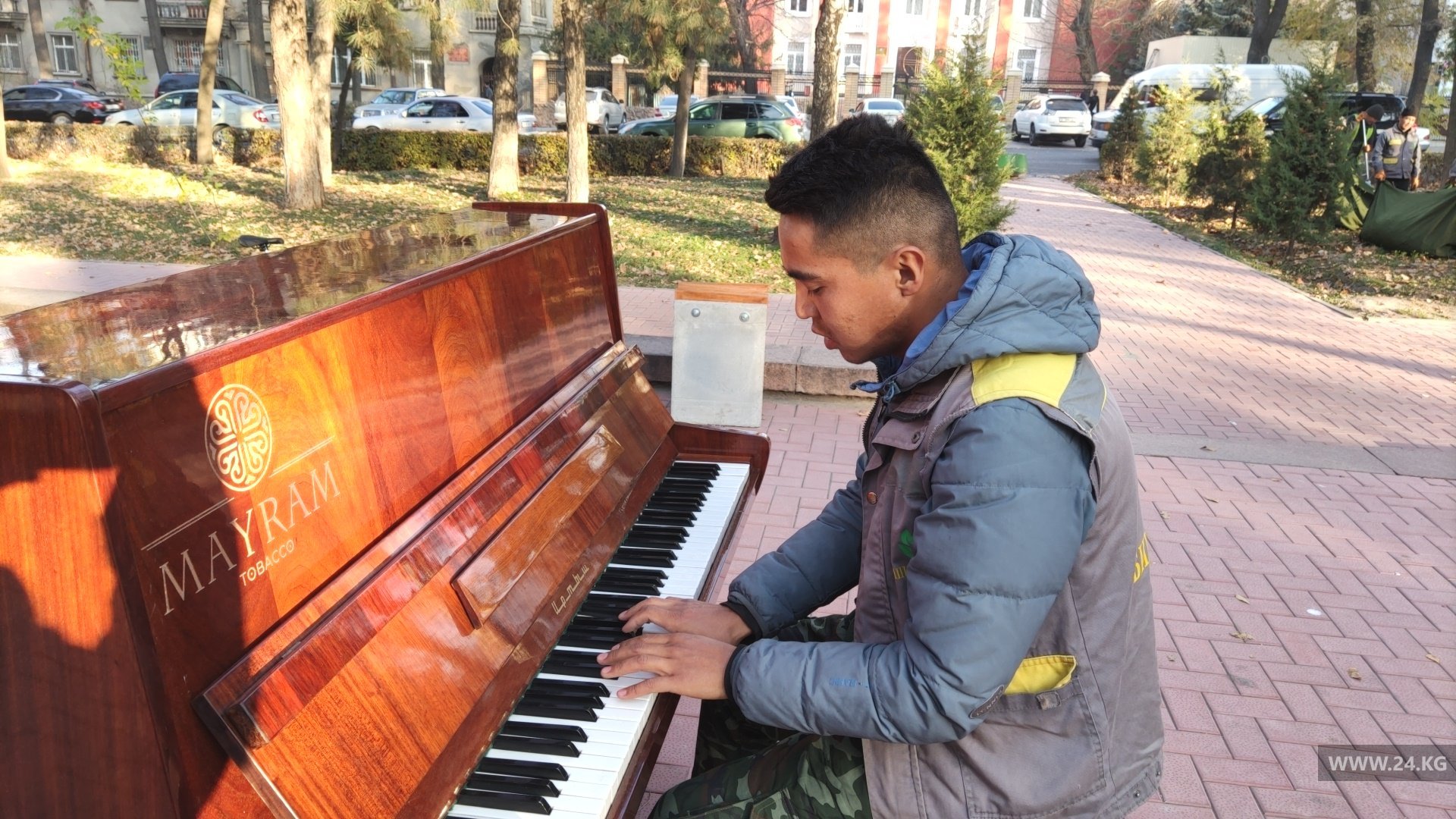 Выставка сопровождалась игрой на пианино и пением рабочих муниципального предприятия. Адилет Джумабаев исполнил итальянскую песню, аккомпонировала ему пианистка Лейли Асанбек.