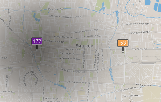- в районе улиц Бейшеналиевой/Токтогула. Уровень загрязнения превышен в 2,45 раза: PM2.5 среднесуточный — 86 мкг/м³, на момент измерения — 172 мкг/м³;