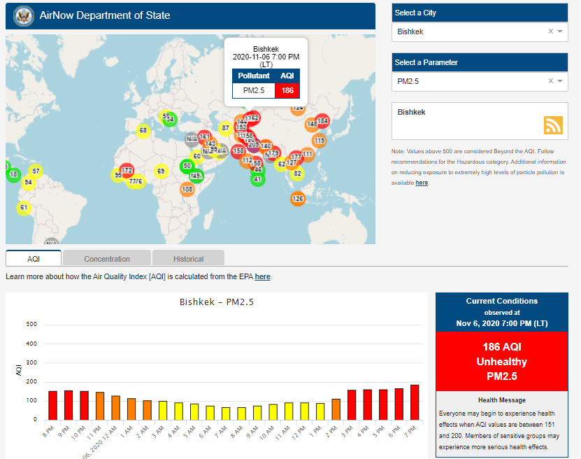Посольство США в Кыргызстане также установило датчик. Он показывает индекс качества воздуха в режиме онлайн. Информация обновляется ежечасно.