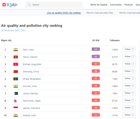 В рейтинге крупнейших городов мира по качеству воздуха World Air Quality на 19.30 Бишкек находится на 3-м месте.