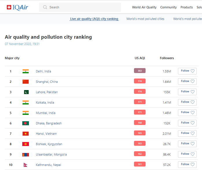 В рейтинге крупнейших городов мира по качеству воздуха World Air Quality на 19.30 Бишкек находится на 8-м месте.