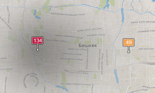 - в районе улиц Бейшеналиевой/Токтогула. Уровень загрязнения превышен в 1,48 раза: PM2.5 среднесуточный — 52 мкг/м³, на момент измерения — 134 мкг/м³;