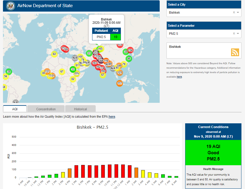 Посольство США в Кыргызстане также установило датчик. Он показывает индекс качества воздуха в режиме онлайн. Информация обновляется ежечасно.