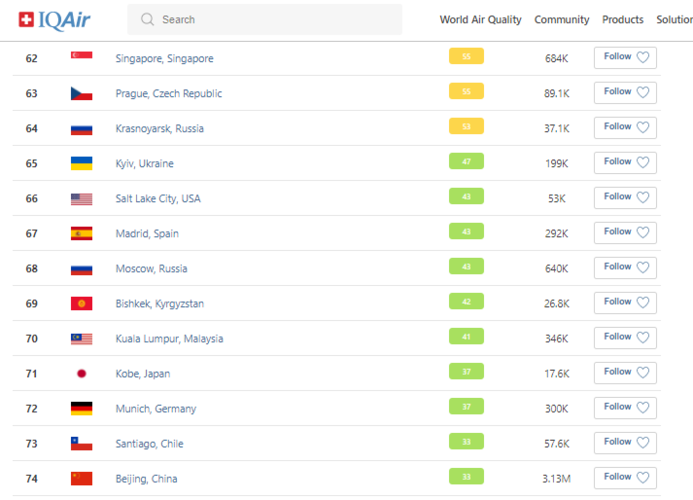 В рейтинге крупнейших городов мира по качеству воздуха World Air Quality на 8.30 Бишкек находится на 69-м месте.