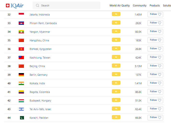В рейтинге крупнейших городов мира по качеству воздуха World Air Quality на 19.30 Бишкек находится на 36-м месте.