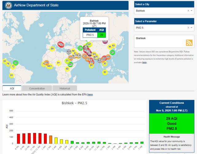 Посольство США в Кыргызстане также установило датчик. Он показывает индекс качества воздуха в режиме онлайн. Информация обновляется ежечасно.