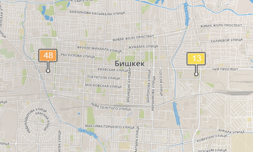 - в районе улиц Бейшеналиевой/Токтогула. Уровень загрязнения превышен незначительно: PM2.5 среднесуточный — 38 мкг/м³, на момент измерения — 48 мкг/м³;