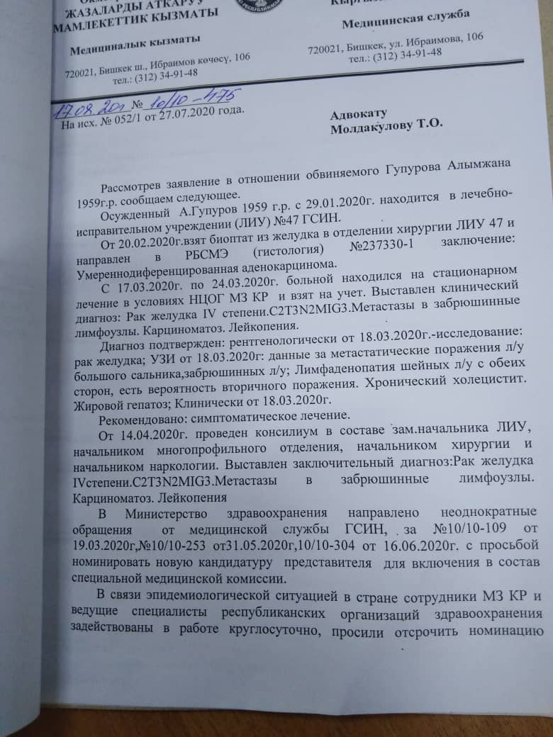 В исправительной колонии № 47 скончался 60-летний Алымжан Гупуров, страдающий от рака четвертой стадии. Об этом 24-kg.com сообщила сестра скончавшегося Мехрибан Гупурова.