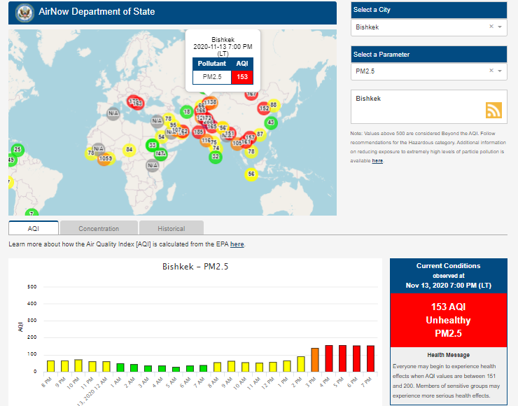 Посольство США в Кыргызстане также установило датчик. Он показывает индекс качества воздуха в режиме онлайн. Информация обновляется ежечасно.