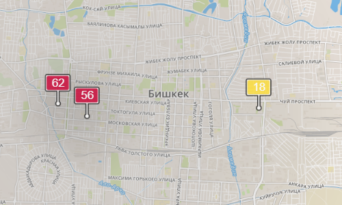 - в районе улиц Бейшеналиевой/Токтогула. Уровень загрязнения превышен в 1,62 раза: PM2.5 среднесуточный — 57 мкг/м³, на момент измерения — 62 мкг/м³;