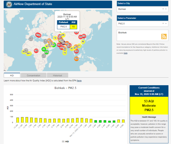 Посольство США в Кыргызстане также установило датчик. Он показывает индекс качества воздуха в режиме онлайн. Информация обновляется ежечасно.