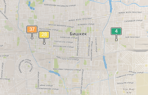 - в районе улиц Бейшеналиевой/Токтогула. Уровень загрязнения превышен в 1,54 раза: PM2.5 среднесуточный — 54 мкг/м³, на момент измерения — 37 мкг/м³;