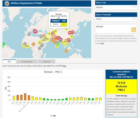 Посольство США в Кыргызстане также установило датчик. Он показывает индекс качества воздуха в режиме онлайн. Информация обновляется ежечасно.