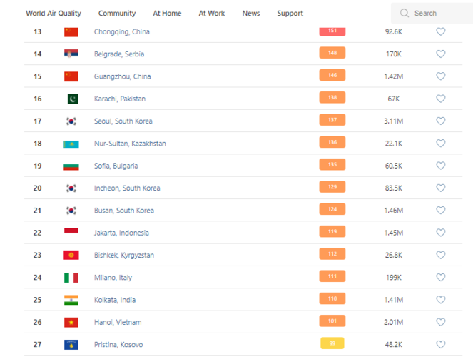 В рейтинге крупнейших городов мира по качеству воздуха World Air Quality на 19.30 Бишкек поднялся на 23-е место.
