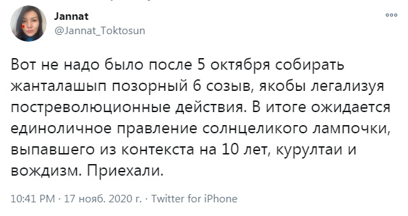 В Facebook отдельные кыргызстанцы посчитали, что предлагаемые изменения несовместимы со свободой и демократией.Действующий депутат парламента Дастан Бекешев тоже высказался в адрес своих коллег.