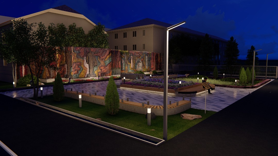Эскизом предусматривается улучшение состояния территории с заменой уличной мебели и покрытия тротуаров, площадок и установкой нового освещения. Помимо этого предлагается открыть взору панно, установить подсветку, убрать на участке заросшую растительность, посадить деревья и обустроить цветники.