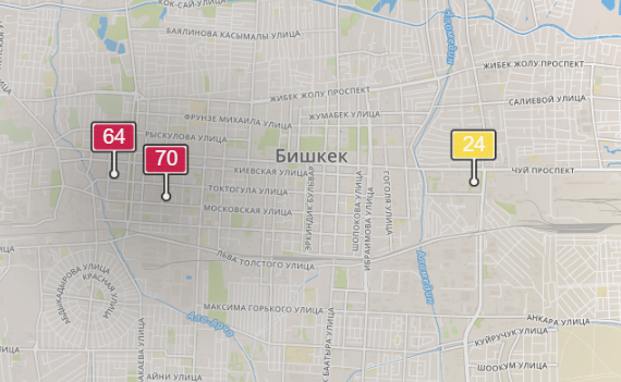 • в районе улиц Бейшеналиевой/Токтогула. Уровень загрязнения превышен в 1,88 раза: PM2.5 среднесуточный — 66 мкг/м³, на момент измерения — 64 мкг/м³;