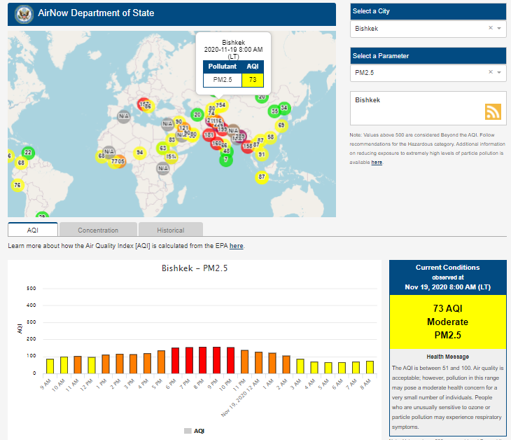 Посольство США в Кыргызстане также установило датчик. Он показывает индекс качества воздуха в режиме онлайн. Информация обновляется ежечасно.