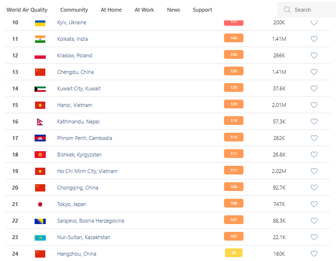 В рейтинге крупнейших городов мира по качеству воздуха World Air Quality на 8.30 Бишкек опустился на 18-е место.