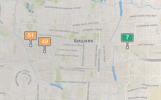 - в районе улиц Бейшеналиевой/Токтогула. Уровень загрязнения превышен в 1,22 раза: PM2.5 среднесуточный — 43 мкг/м³, на момент измерения — 51 мкг/м³;