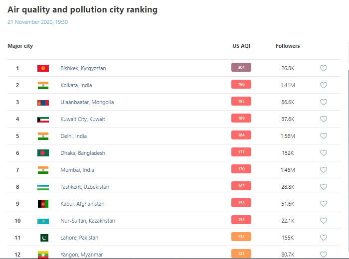 В рейтинге крупнейших городов мира по качеству воздуха World Air Quality Бишкек находится на 1-м месте.