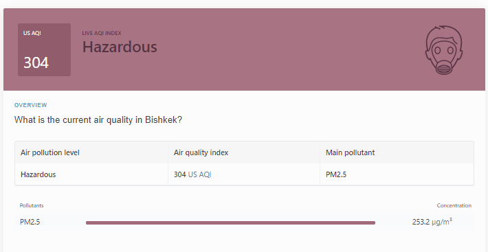 В 19.30 статус города отмечен как «опасно» (Hazardous). Индекс качества воздуха, по данным сайта, составляет 304 (AQI), а замеры концентрации мелких частиц PM2.5 показали 253,2 мкг/м³.