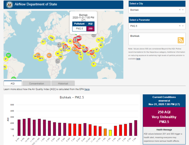 Посольство США в Кыргызстане также установило датчик. Он показывает индекс качества воздуха в режиме онлайн. Информация обновляется ежечасно.