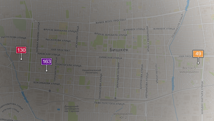 - в районе улиц Бейшеналиевой/Токтогула. Уровень загрязнения превышен в 3,8 раза: PM2.5 среднесуточный — 133 мкг/м³, на момент измерения — 130 мкг/м³;
