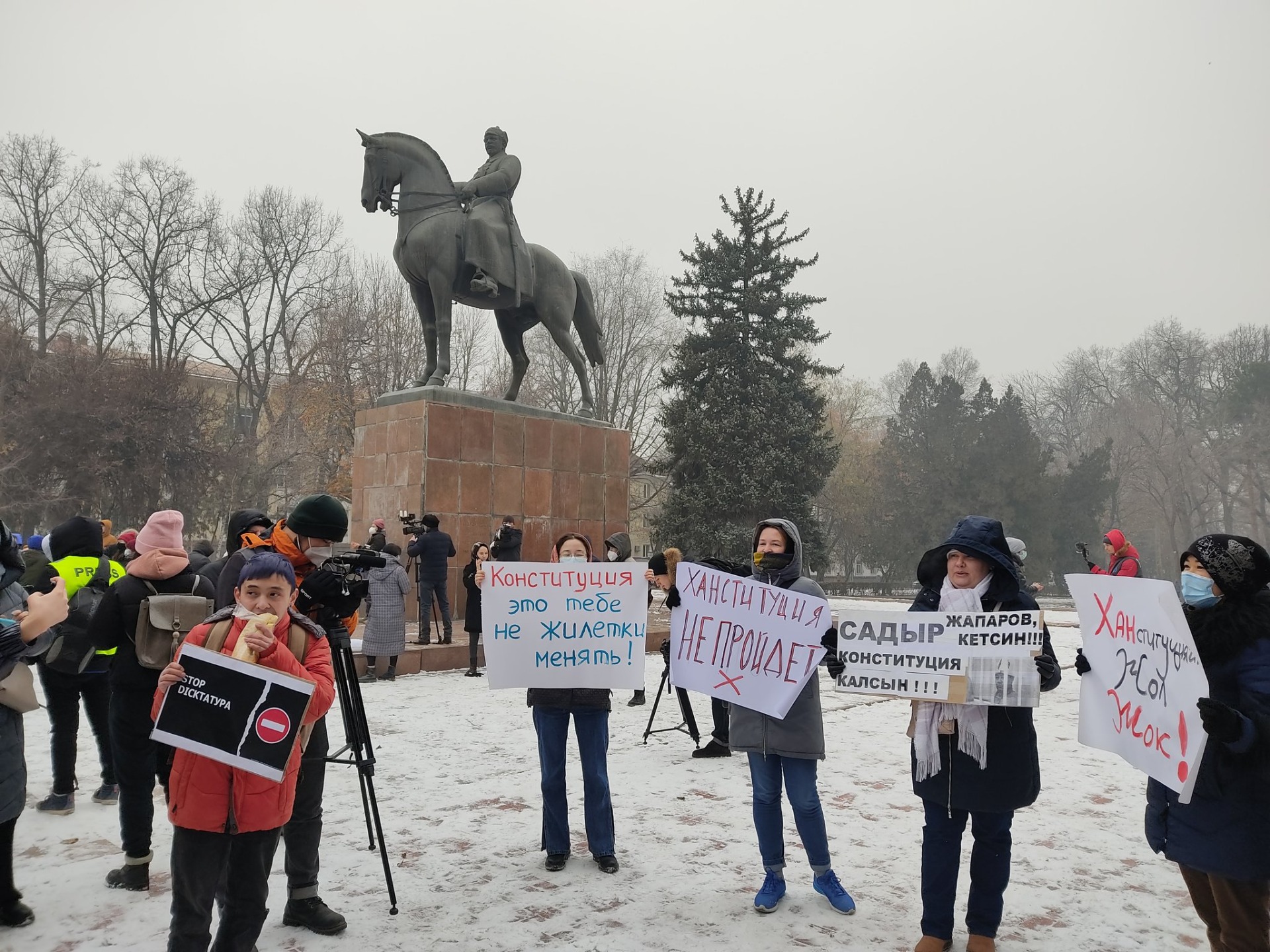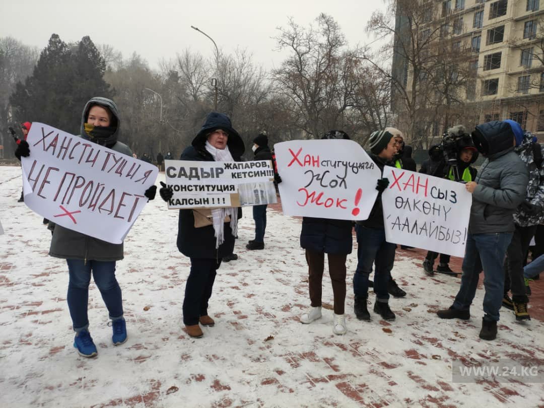 Активисты собираются на бульваре Эркиндик возле железнодорожного вокзала. Они держат плакаты с призывами не менять Основной закон страны и не превращать Кыргызстан в ханство.