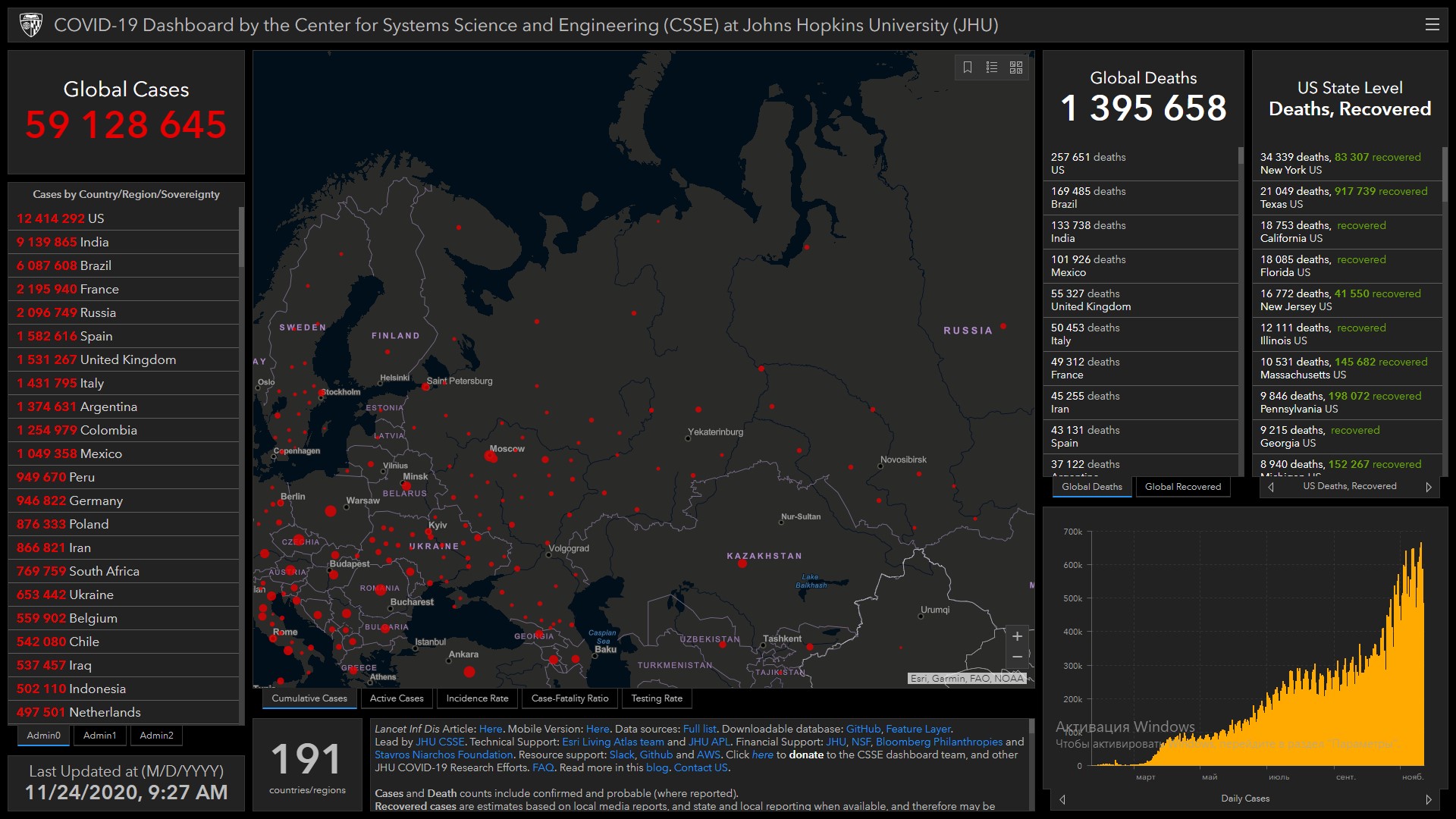 Всего в мире коронавирусом заразились 59 миллионов 128 тысяч 645 человек. Больше всего зараженных в США (12 миллионов 414 тысяч 292), Индии (9 миллионов 139 тысяч 865), Бразилии (6 миллионов 87 тысяч 608), Франции (2 миллиона 195 тысяч 940), России (2 миллиона 96 тысяч 749), Испании (1 миллион 582 тысячи 616), Великобритании (1 миллион 531 тысяча 267), Италии (1 миллион 431 тысяча 795), Аргентине (1 миллион 374 тысячи 631) и Колумбии (1 миллион 254 тысячи 979).