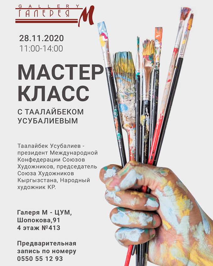 Мастер-класс по живописи с акрилом проведет художник Таалайбек Усубалиев. В стоимость включены материалы и кофе-брейк. Регистрация по телефону 0550551293.