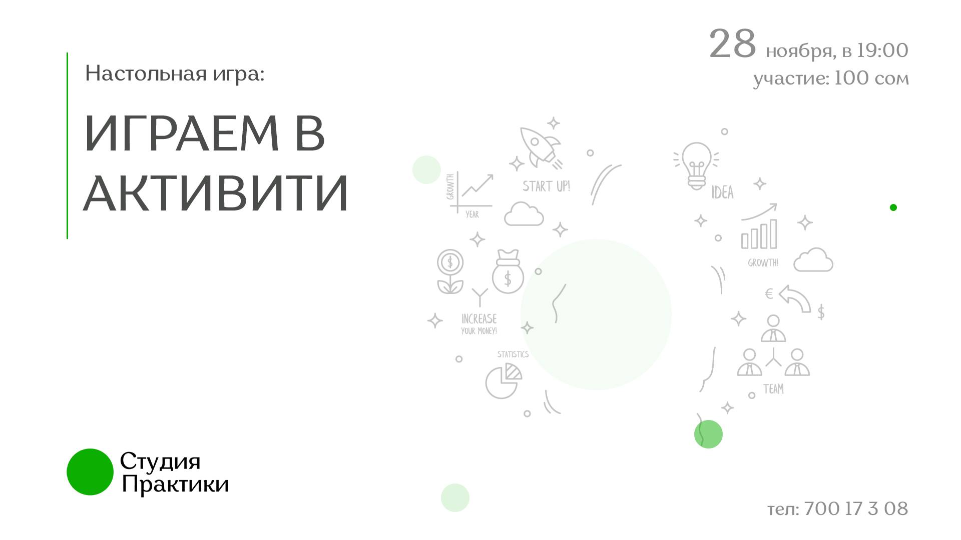 «Активити» — невероятно веселая командная игра. Используются все виды коммуникаций: мимика, графика, вербальное и невербальное общение. Цель игры — отгадывание слов. Всем, кто любит новые знакомства, общение, веселое и полезное времяпровождение. Регистрация по телефону 0700173308.