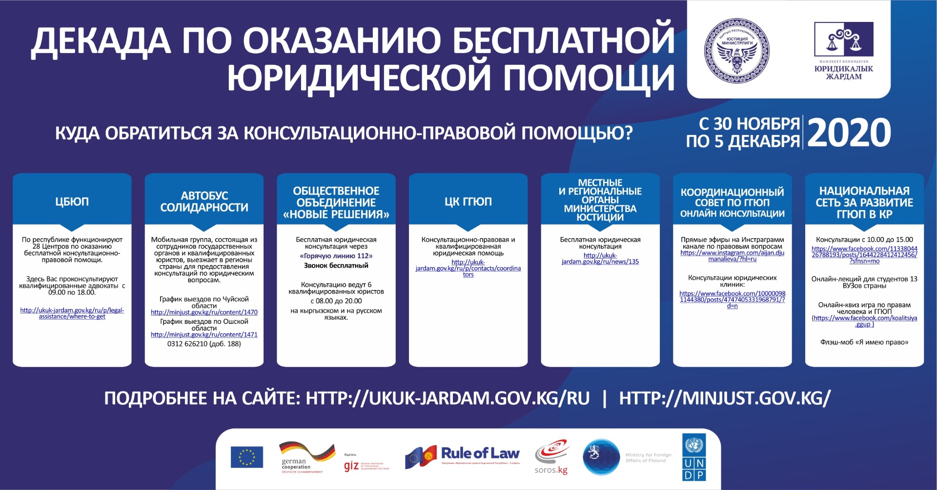 С сегодняшнего дня в Кыргызстане стартует декада Минюста по оказанию бесплатной консультационно-правовой помощи населению. Об этом сообщает пресс-служба министерства.