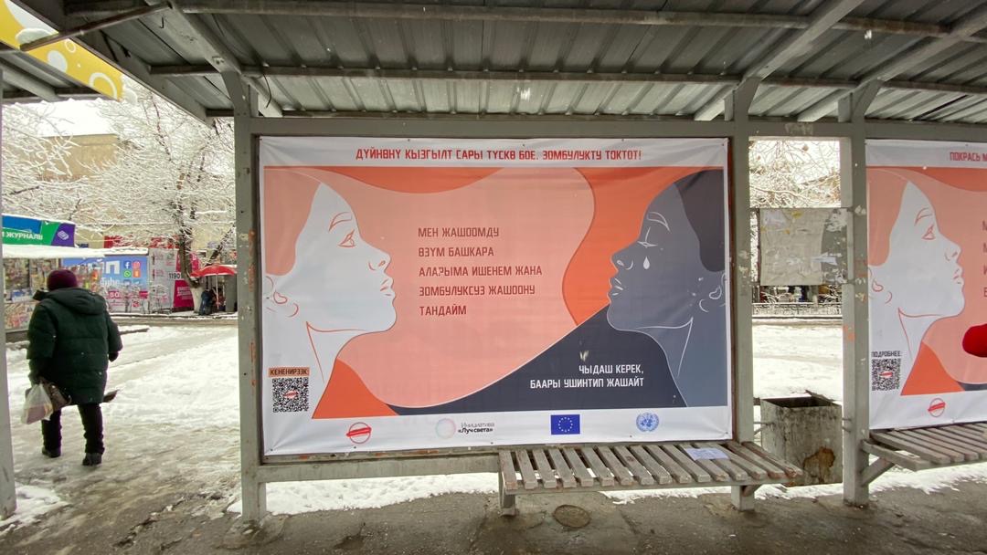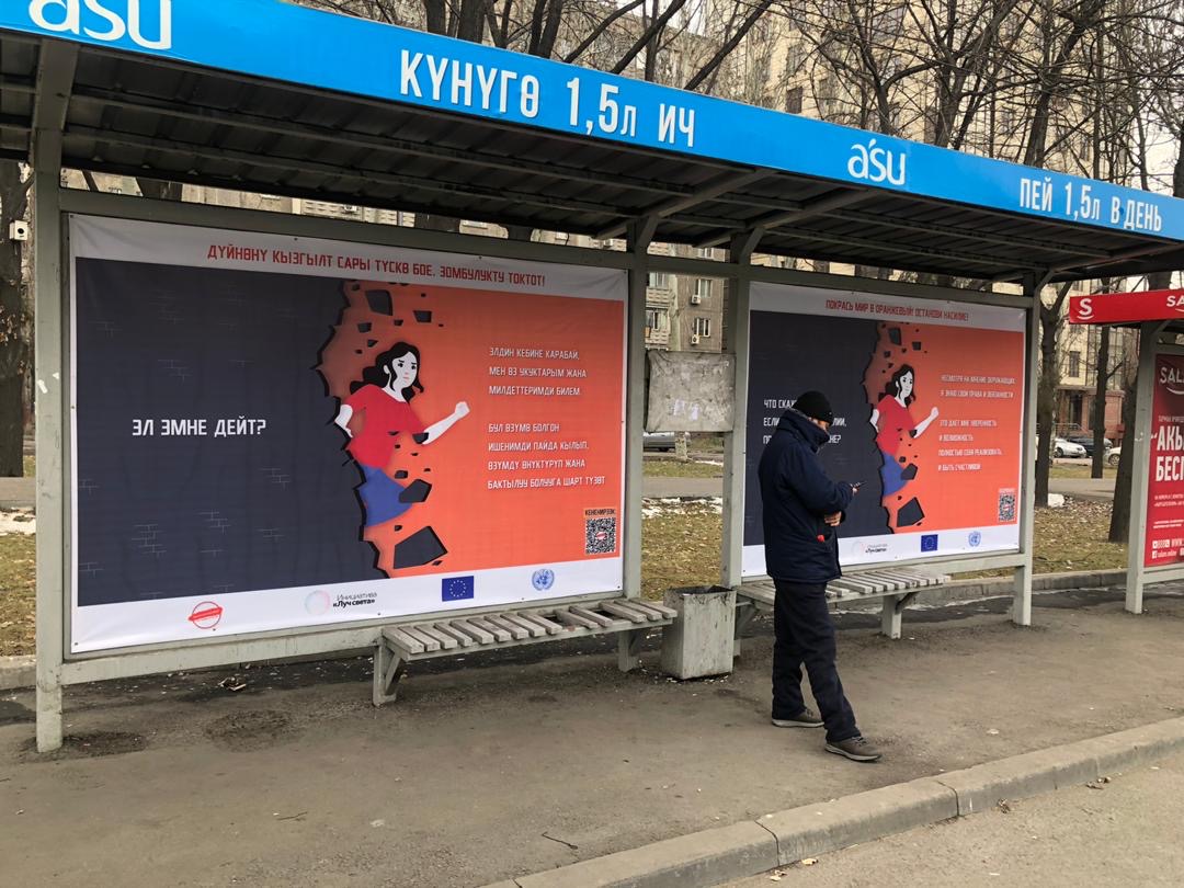В Бишкеке на остановках общественного транспорта появились информационные баннеры, посвященные 16-дневной кампании против гендерного насилия. Об этом сообщили в структуре «ООН-женщины».